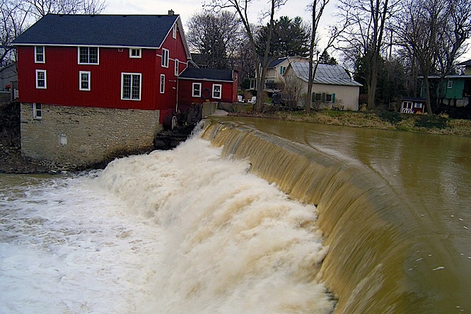 A small handicapped accessible viewing area for Honeoye Falls is located in the northeast corner of the parking lot, next to the large three story stone office building. The building was originally a mill. It was built during the period from 1827 to 1837. In 1985 the Town of Mendon purchased the building to house the town offices.