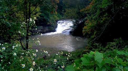 Park along Route 39 (Main Street) near the bridge over Walnut Creek on the west side of the village between Chestnut and Walnut Streets. Walk westwards along Route 39 to Walnut Street and turn right (north). In roughly 350 feet look to your right (southeast) for a view of Walnut Creek Falls which is about 250 feet away.