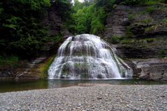 Beginning at the Upper Park Entrance, park in the lot closest to "The Old Mill." This area was once known as Enfield Falls, a small community that grew up around the mill in the early 1800’s. Located behind the mill is the Falls by The Old Mill, sometimes called Fish Kill Falls because it is located on Fish Kill, a tributary of Enfield Creek. This is a terraced waterfall, with two nearly equal leaps that total 15 feet in height. The 15 foot wide crest of the first leap faces to the northeast, with the crest of the second leap facing more towards the north. A small set of rapids, found just downstream of the falls adds to its charm.