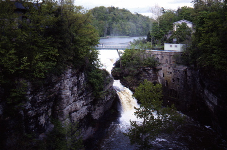Triphammer Falls is located on Fall Creek at the base of the dam that forms Beebe Lake. The falls can be seen from the Thurston Ave. Bridge or a foot bridge that passes almost directly over the falls. The total drop of the dam and falls is 80 feet.