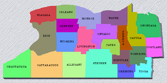 Allegany |Cattaraugus |Cayuga |Chautauqua |Chemung |Cortland |Erie |Genesee Livingston |Monroe |Niagara |Onondaga |Ontario |Orleans |Schuyler |Seneca Steuben |Tioga |Tompkins |Wayne |Wyoming |Yates Or you can use the blue button of thepull down menu below to select a county.