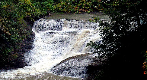 Park along Route 39 (Main Street) near the bridge over Walnut Creek on the west side of the village between Chestnut and Walnut Streets. Walk westwards along Route 39 to Walnut Street and turn right (north). In roughly 350 feet look to your right (southeast) for a view of Walnut Creek Falls which is about 250 feet away.
