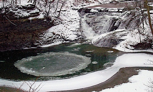The photo below was taken on Jan. 19, 2008. The large pancake shaped disk of ice is known as an ice whirl. Roughly 23 feet across the disk slowly rotated counter clockwise because of the surface currents in the plunge pool. It took 87 seconds for the disk to make one revolution. This is the largest ice whirl that I have seen.