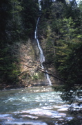 Return to the South Branch and head downstream. About 0.2 of a mile from the old bridge abutment you will arrive at the base of Gossamer Cascade. For a better view of this 130 foot high cascade you will have to cross the creek. Choose your crossing spot carefully, avoiding swift moving water and being mindful of loose and slippery rocks.