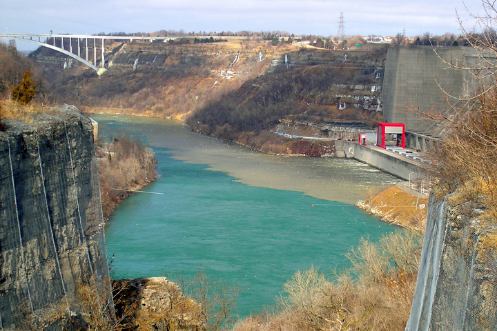 This is a telephoto shot taken from the same location as the previous photo. To the right is the Robert Moses Powerplant. Apparently the muddy water exiting the power plant is the result of very heavy rains a few days before the photo was taken. Muddy water from area streams flowed into the Niagara River, was drawn into the power-plant reservoir and is being discharged into the river. The Lewiston-Queenston Bridge can be seen in the distance.