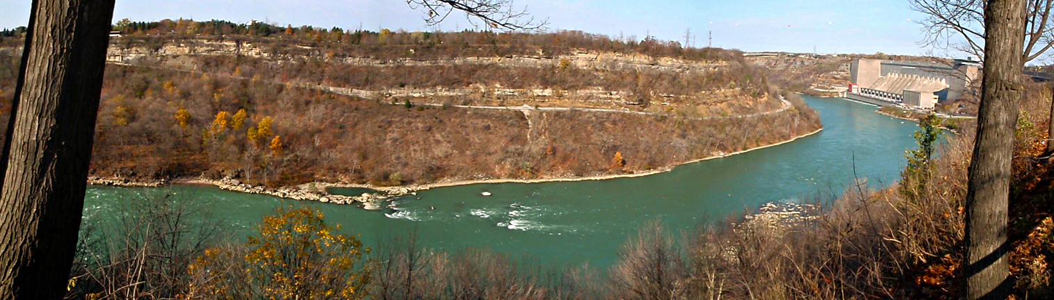 A view from Devils Hole State Park. You are looking to the north at the Ontario wall of the Niagara Gorge. The access road to the Adam Beck Power-plant can be seen descending into the gorge. The Robert Moses Powerplant can be seen on the right side of the photo. It is about 0.6 of a mile away.