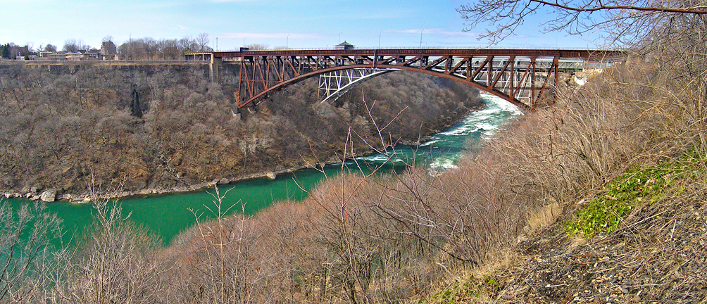 The beginning of the Whirlpool Rapids can be seen below the Michigan Central Railway Bridge. The bridge was built in 1924 to replace an existing cantilever bridge which was located about 100 feet up river. The railway is roughly 240 feet above the river. The bridge has been closed since 2001. The silver bridge just beyond it is the Whirlpool Rapids Bridge.