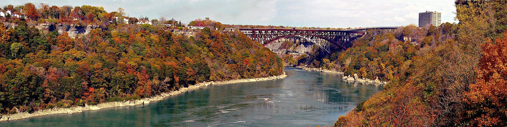 An early November view of the end of the Upper Great Gorge. The Michigan Central Railway Bridge and Whirlpool Rapids Bridge can be seen in the distance. The Whirlpool Rapids Bridge was completed on August 27th 1897.