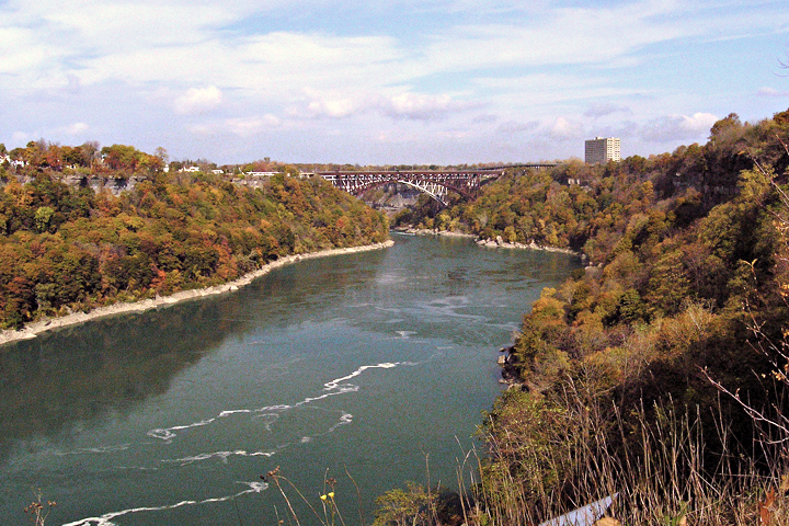 The end of the Upper Great Gorge during low water. On November first the flow of water over Niagara Falls and through the Niagara Gorge is cut in half from its summertime volume. The lower volume causes the river level to drop 11 feet exposing more rocks along the river banks.