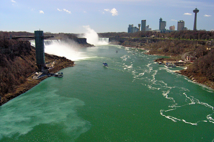A view from the Rainbow Bridge of the beginning of the Upper Great Gorge and Niagara Falls. The American and Bridal Veil Falls are on the right with the Horseshoe Falls visible in the distance. Ontario, Canada is to the right.