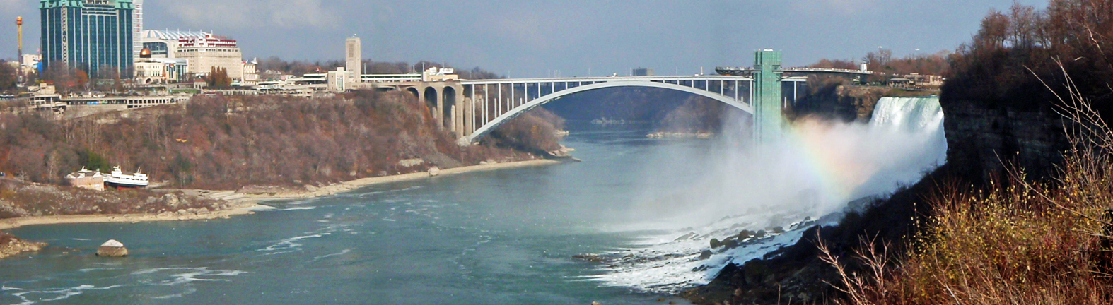 A view of the American Falls and Maid Of The Mist boat docks from the southwest corner of Goat Island. In this early wintertime view, the lower water level caused by the powerplants is very evident on the Canadian river bank. The level of the river drops 11 feet because of the powerplant diversions of the river above the falls.
